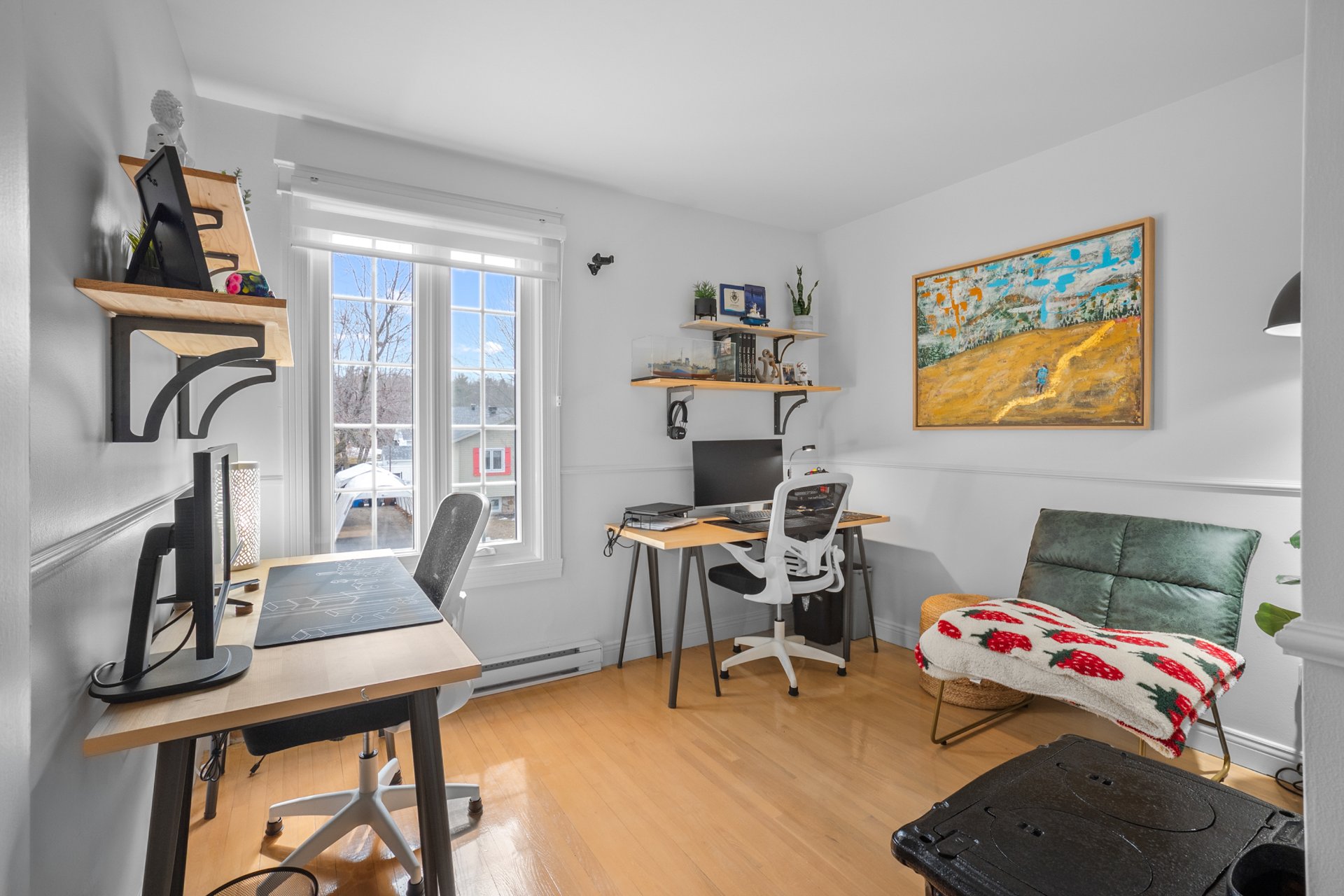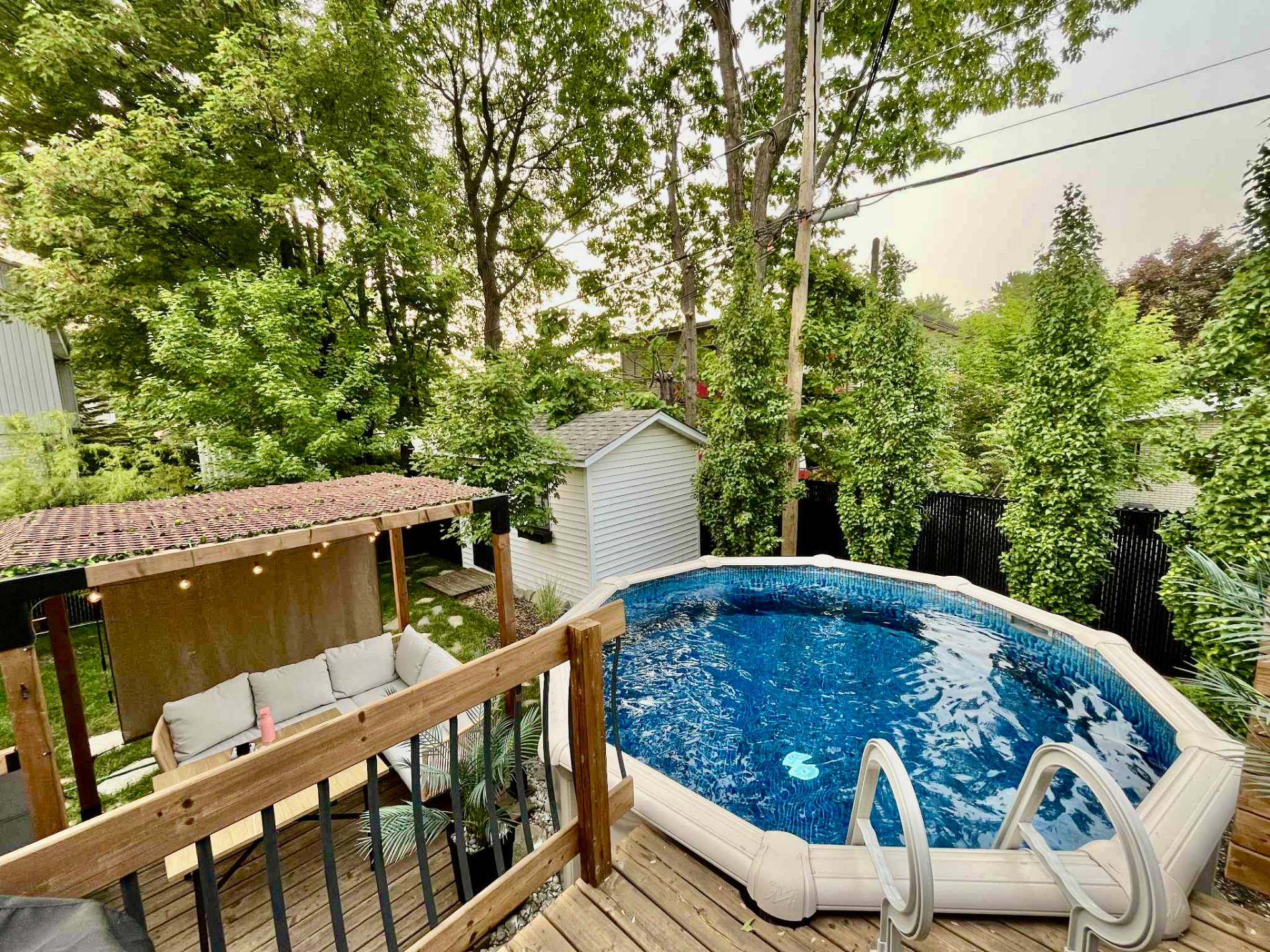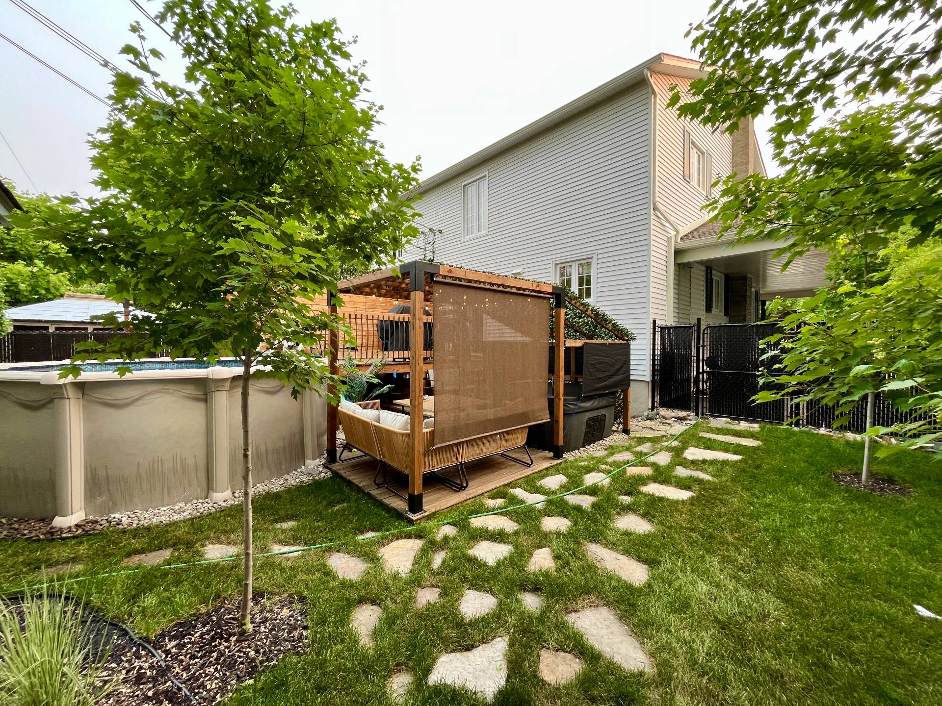 Lustre, stores du rez-de-chaussée fait sur mesure ,petit cellier, tablette 'live-edge' du salon, tablettes du bureau, meuble sous la télé du salon,petite télé de la cuisine et son support téléscopique, piscine hors-terre 12 pieds et son filtreur 2017 environ (pompe, plomberie, écumoir et toile 2025 environ), pergola, remise, foyer au propane, barbecue connecté au propane, thermopompe murale, tablette dans le sous-sol, aspirateur central et accessoires, bacs roulants.