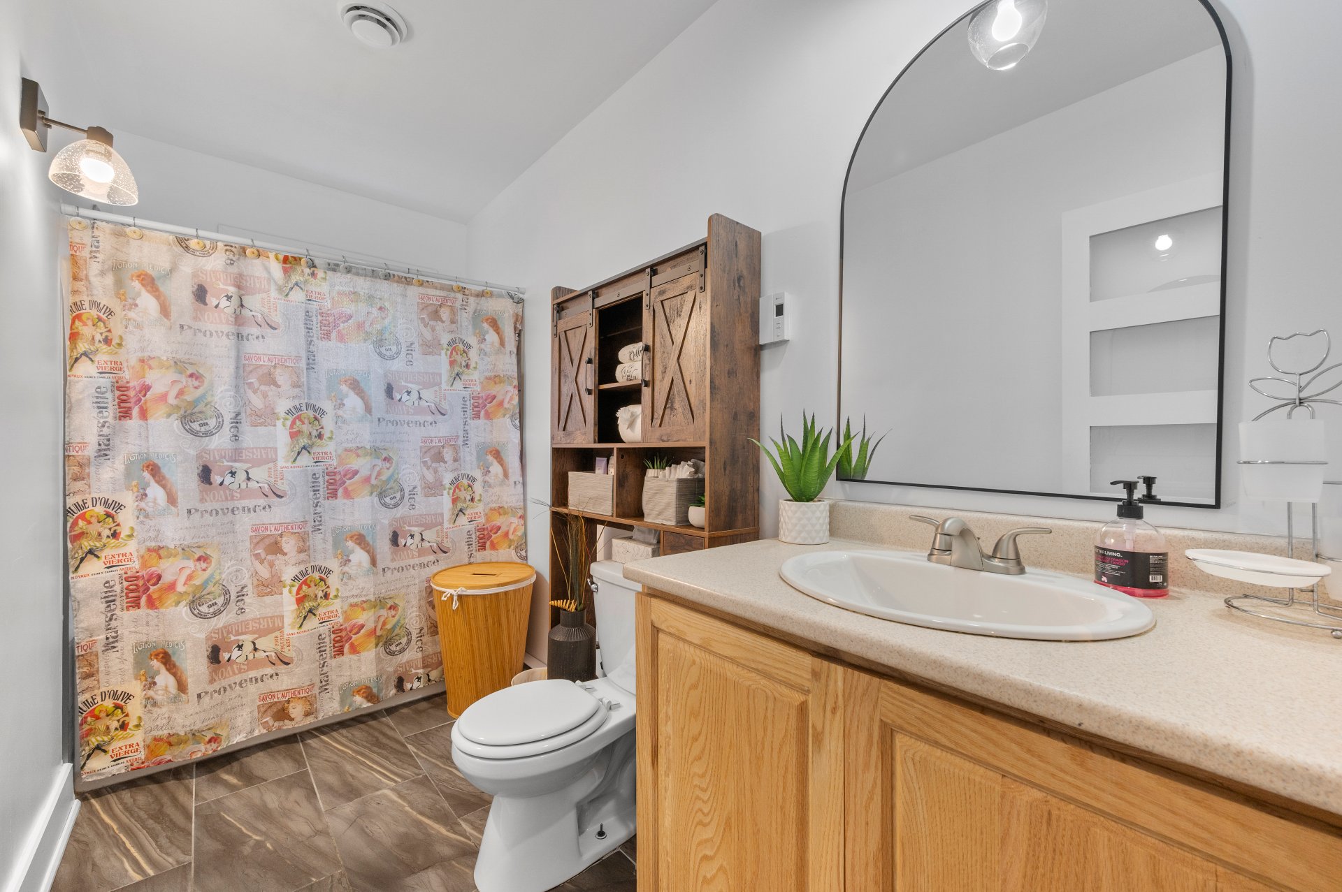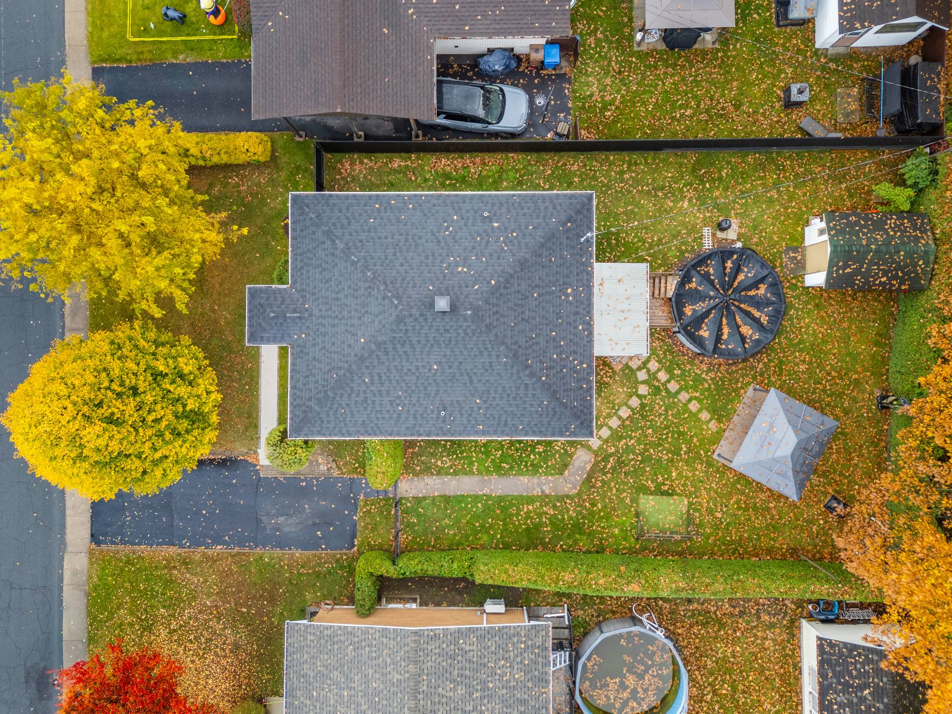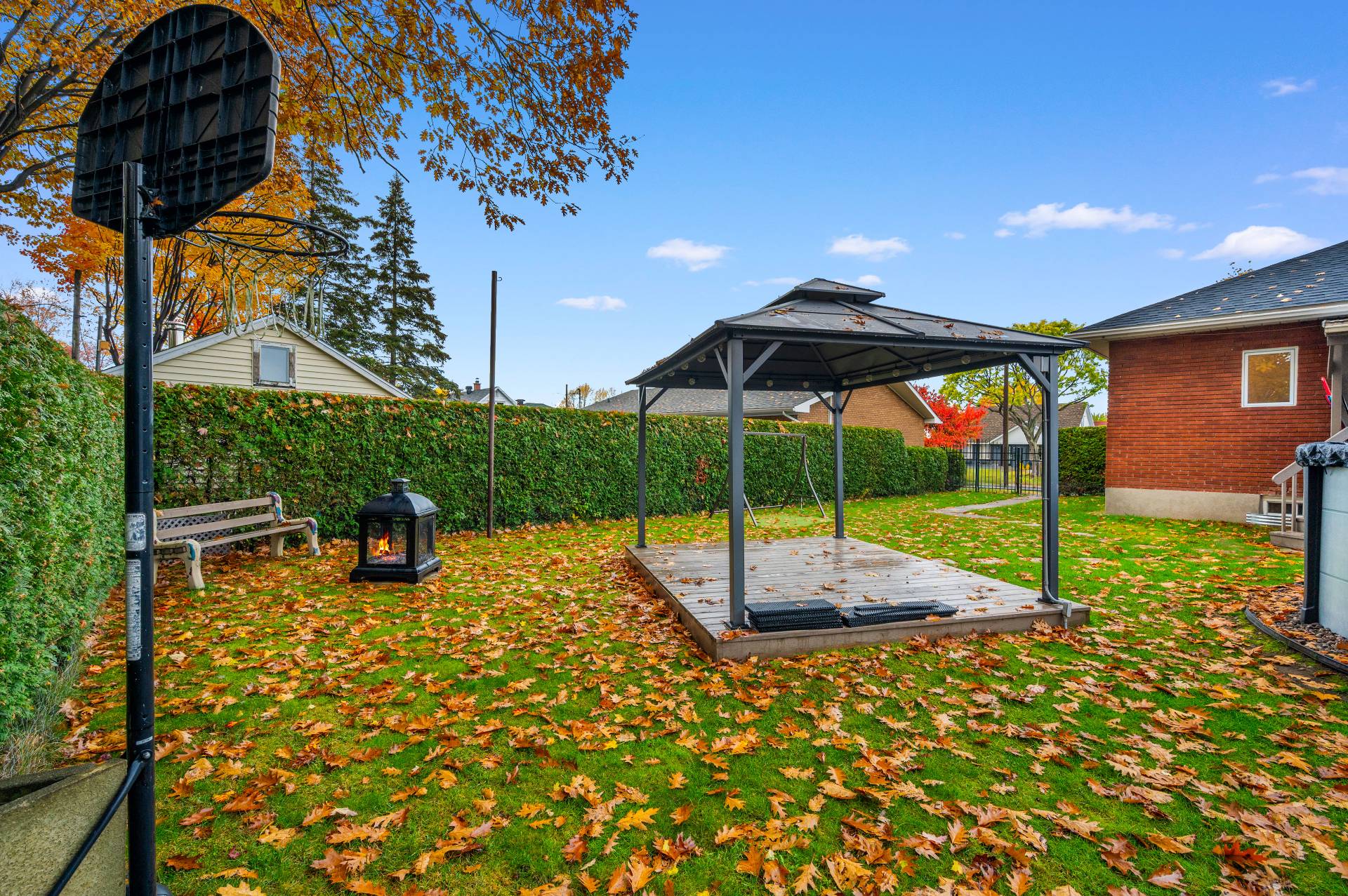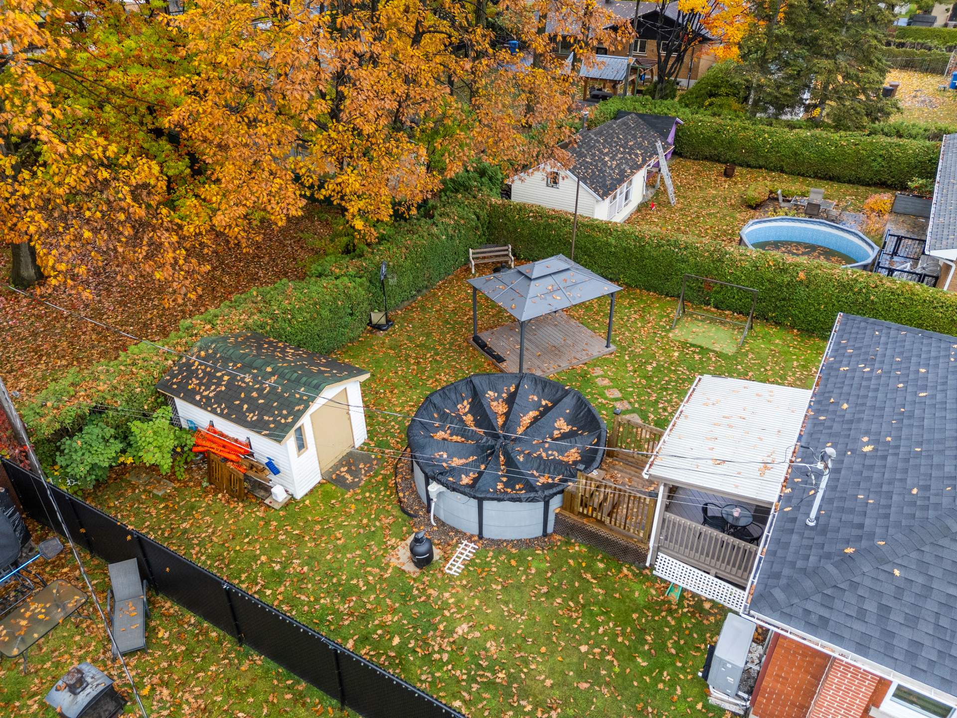 Luminaires, stores, remise, gazébo, piscine hors-terre 15 pieds au chlore non-chauffée, meuble de rangement dans la salle de bains.