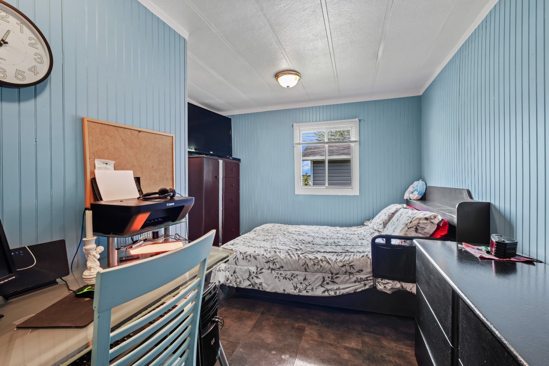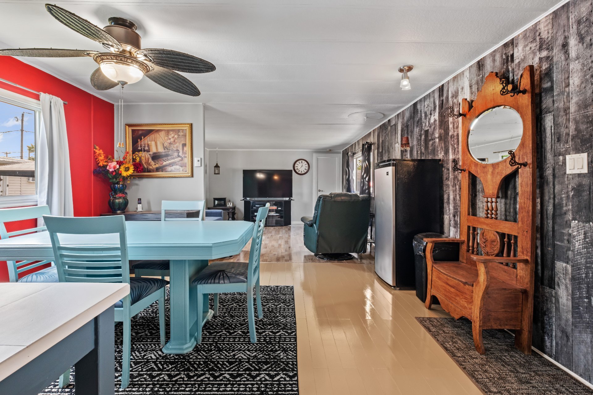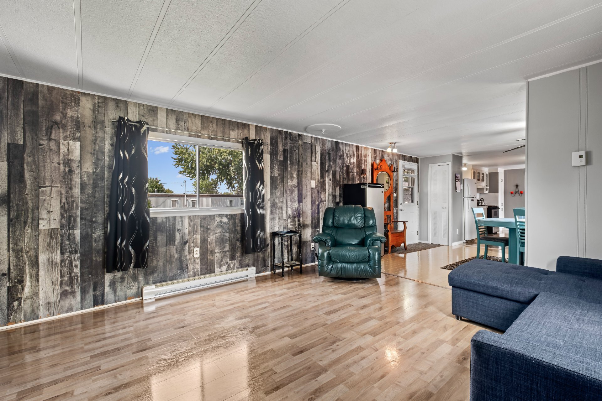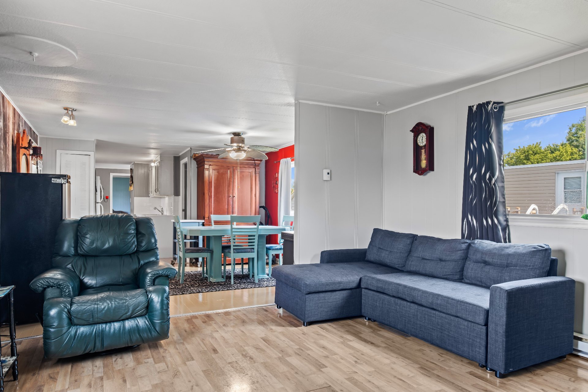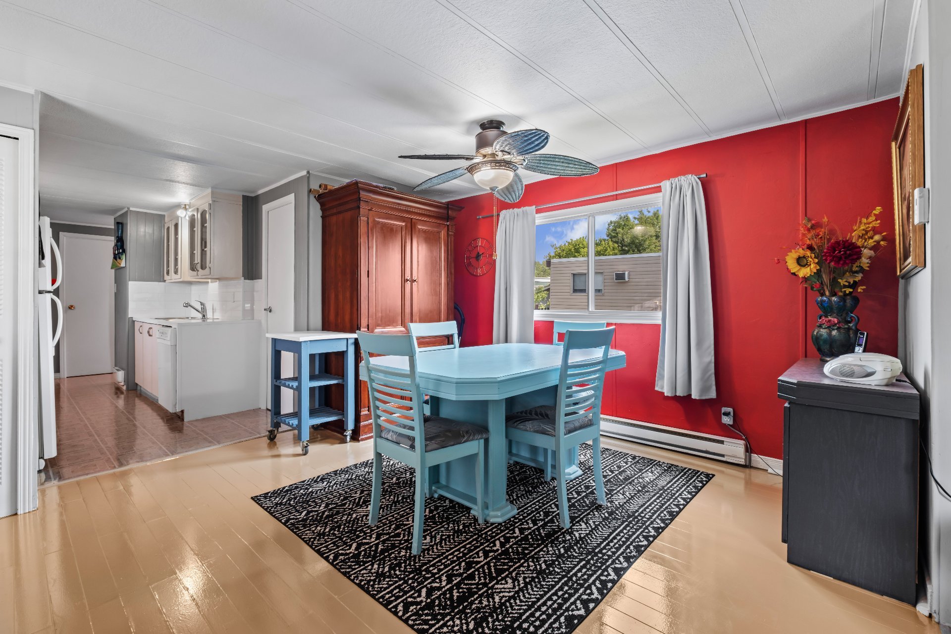 Lave-vaisselle, congélateur debout, 2 climatiseurs portatifs, grande armoire de bois dans la salle à manger, balançoire extérieur, remise, stores, rideaux et fixture, luminaires et plafonniers