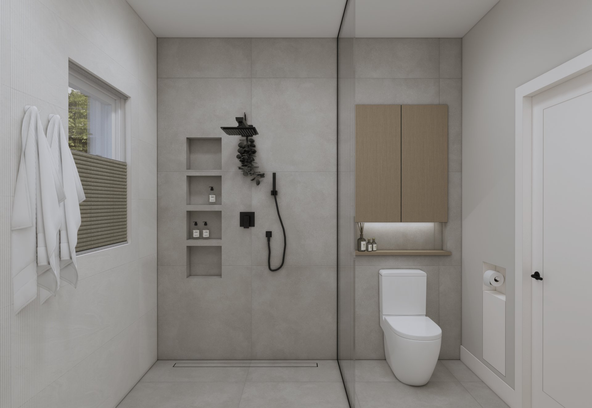 Hotte de cuisinière encastrée, réservoir à eau chaude, échangeur d'air, thermompe murale (Wifi), meuble TV encastré, mobilié de rangement (CAC), mobilié salle de lavage.