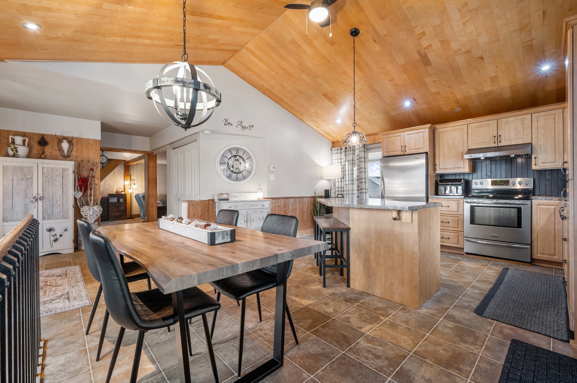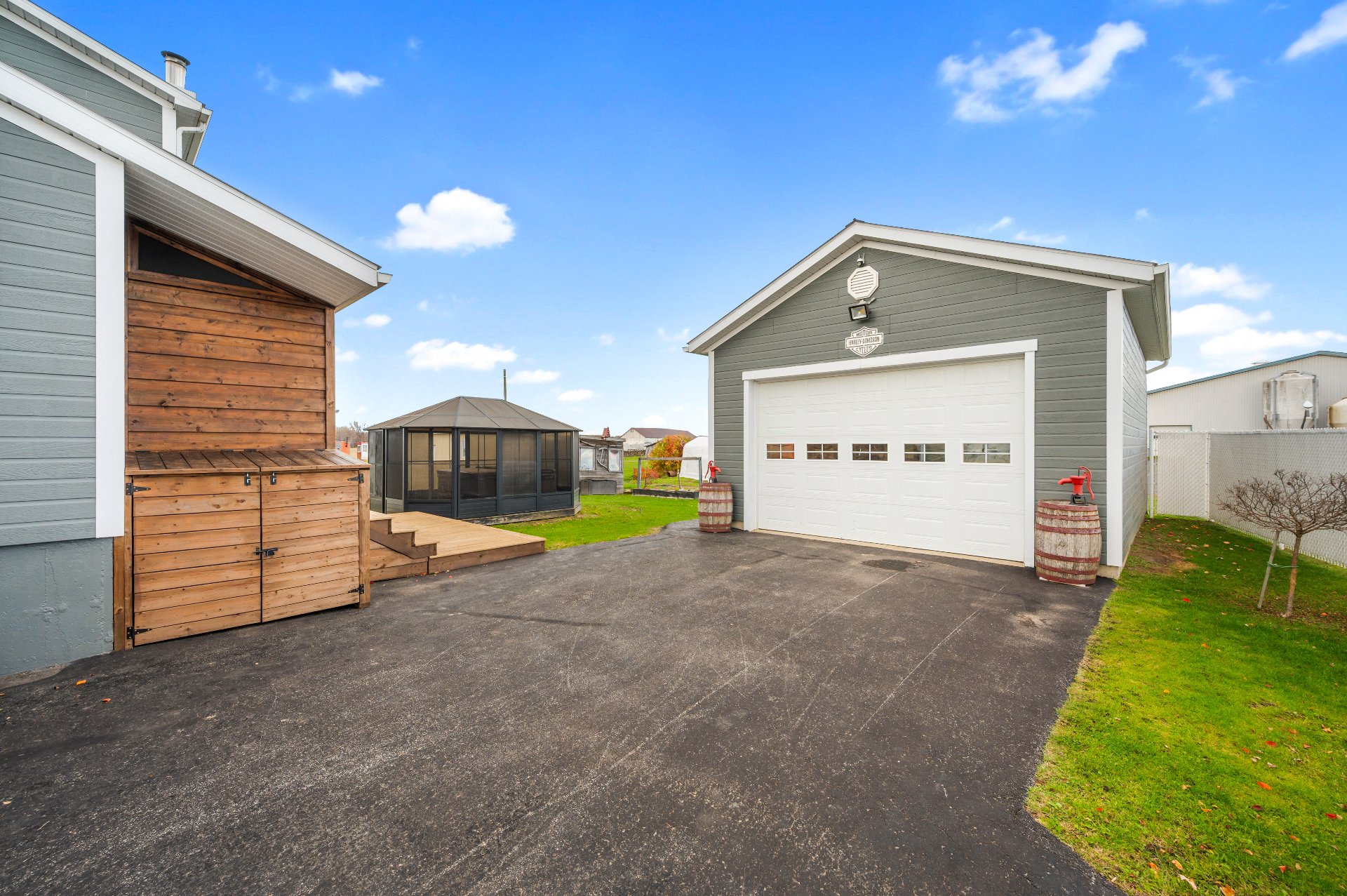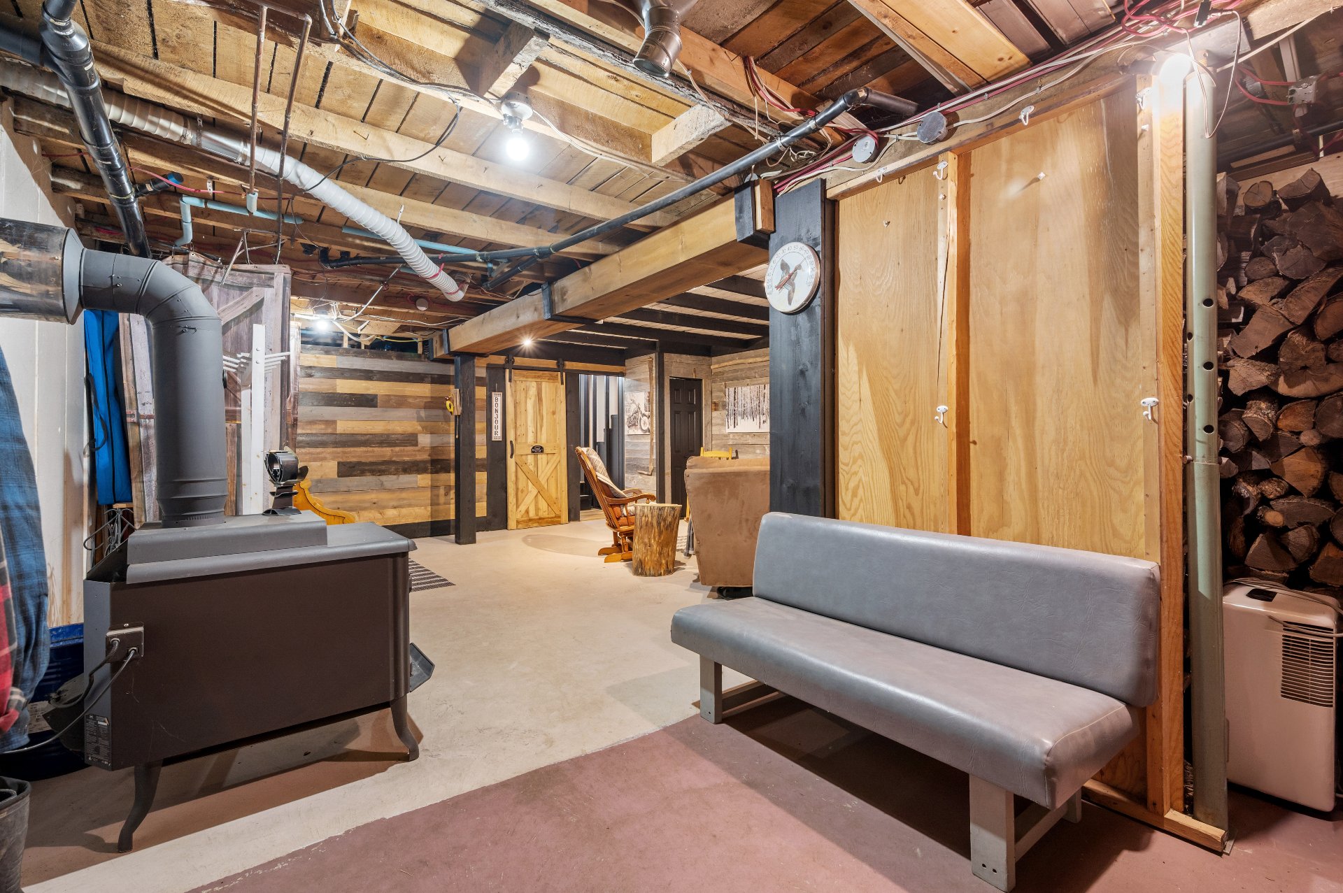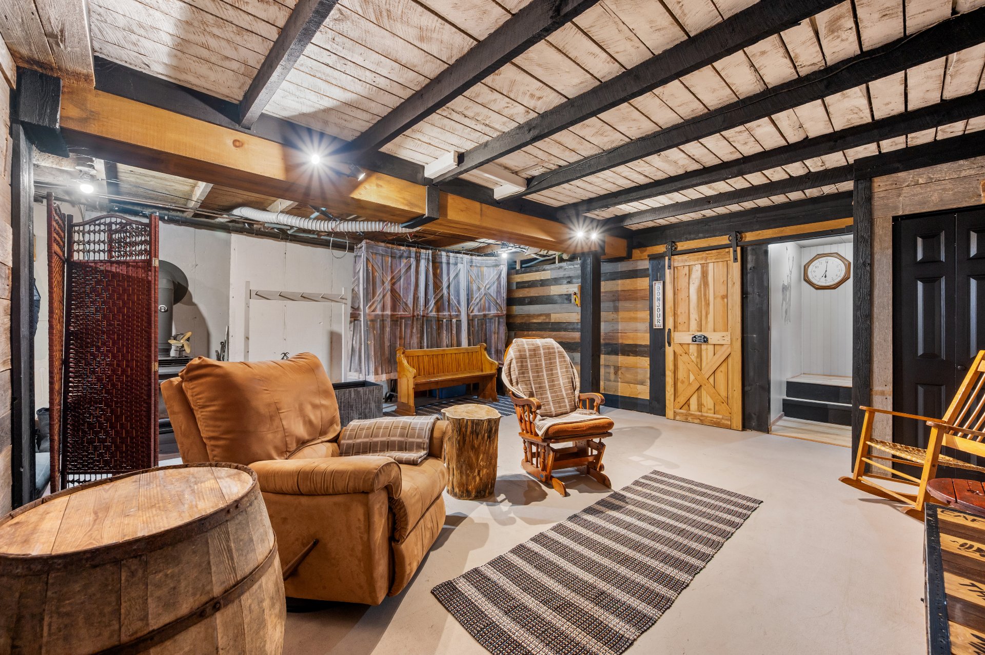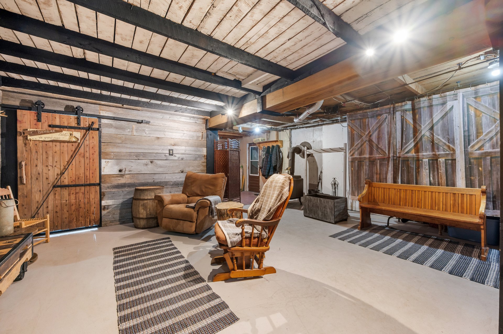 Luminaires de la SDM et de la cuisine, pôles et rideaux. Porte de bois de granche au sous-sol avec sa rail, les clôtures de perches, le banc de parc & les deux barils de bois extérieurs. Les coffres de stainless du garage