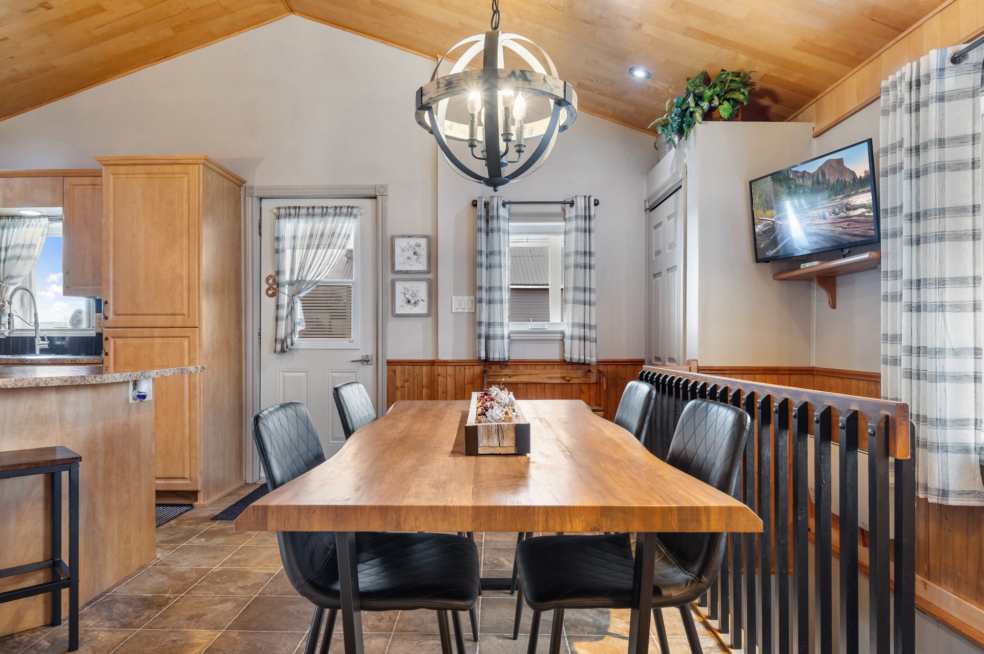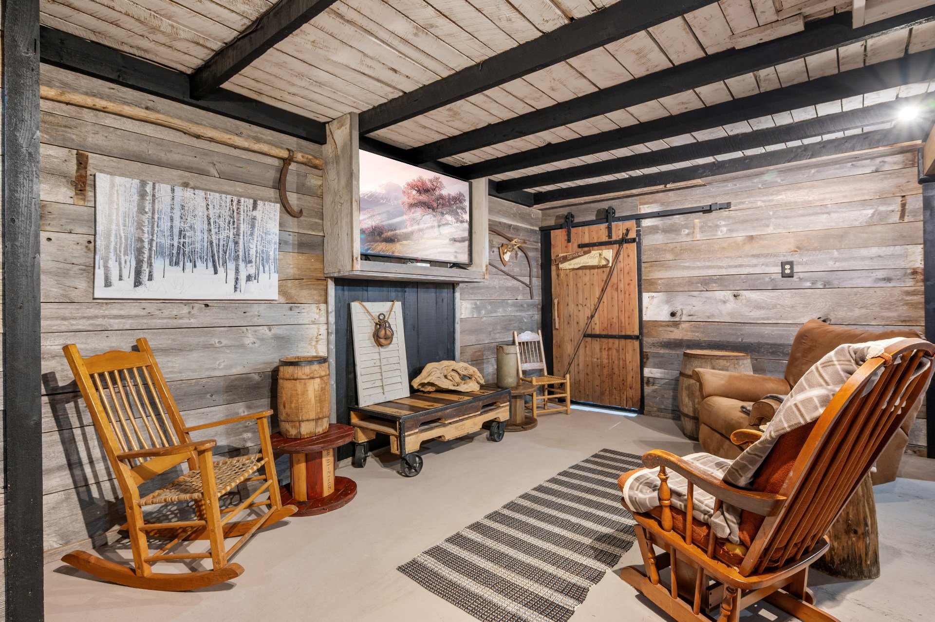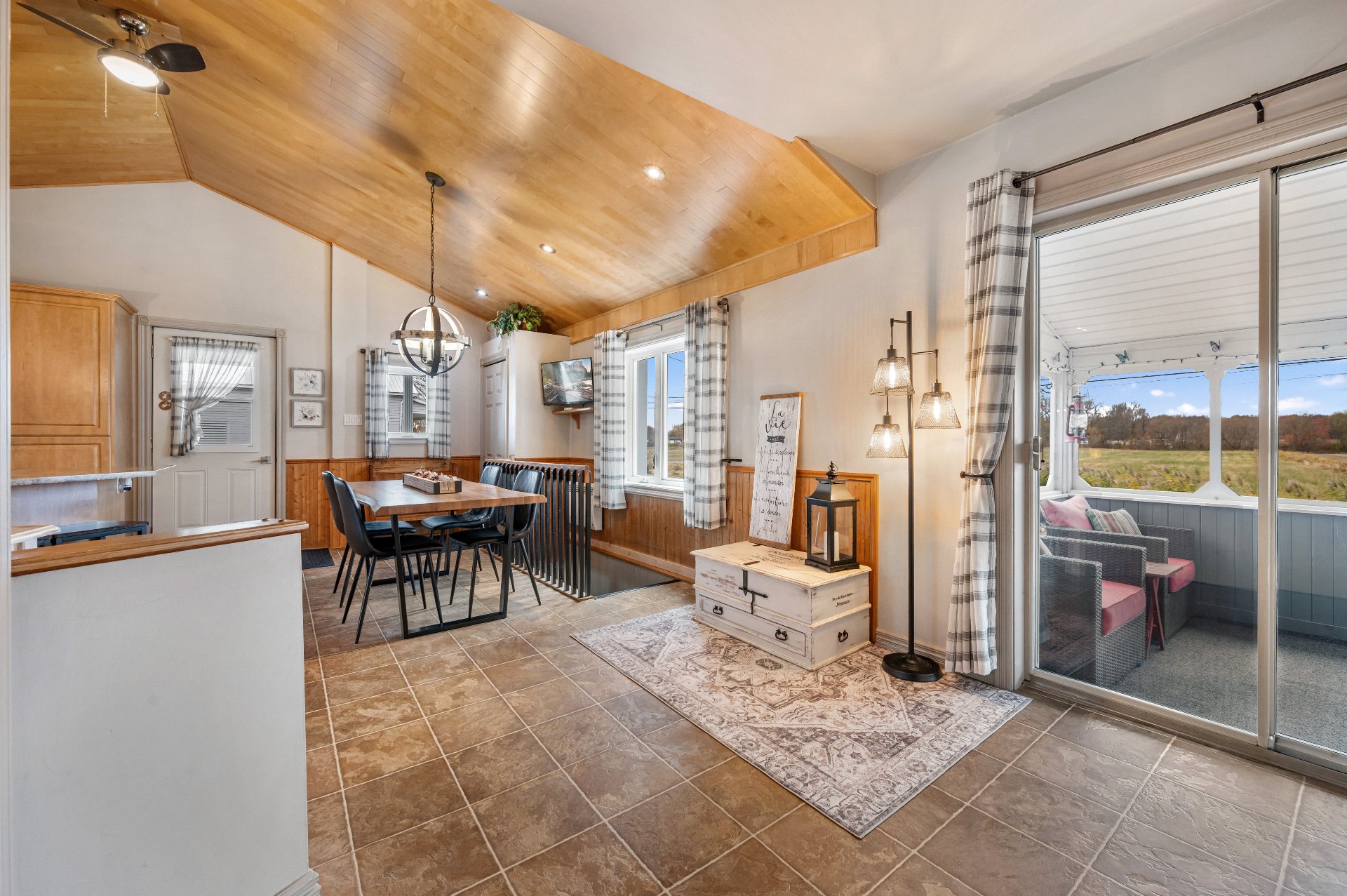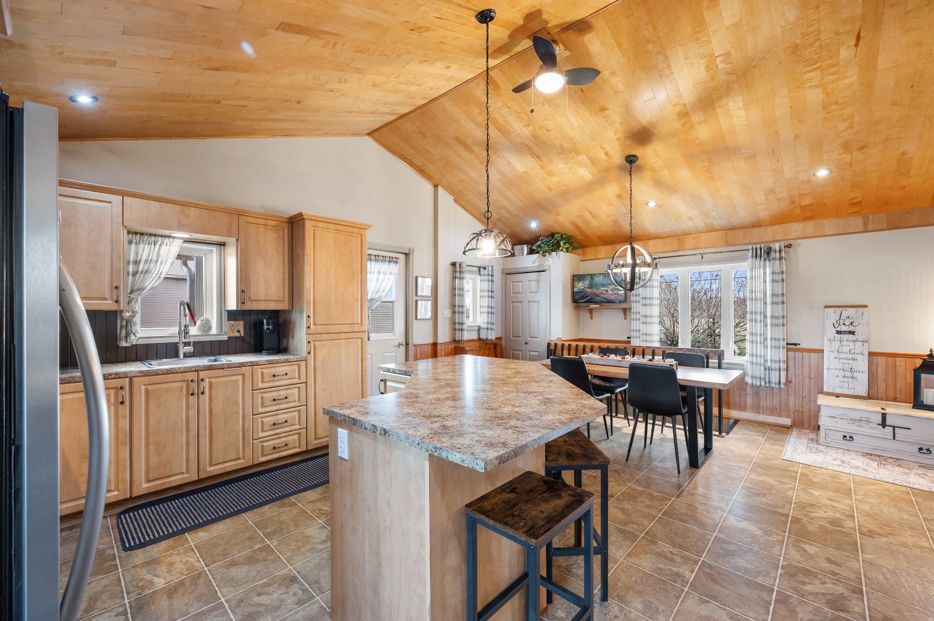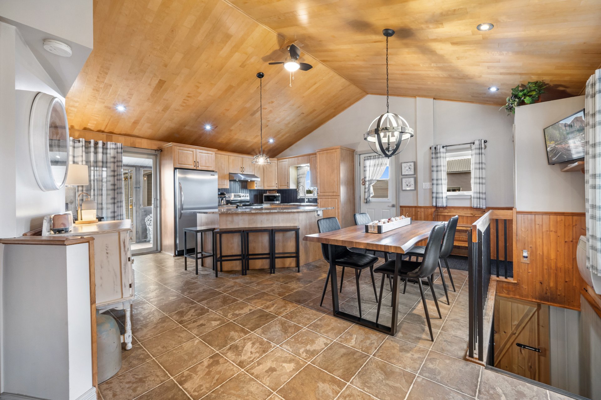 Luminaires de la SDM et de la cuisine, pôles et rideaux. Porte de bois de granche au sous-sol avec sa rail, les clôtures de perches, le banc de parc & les deux barils de bois extérieurs. Les coffres de stainless du garage