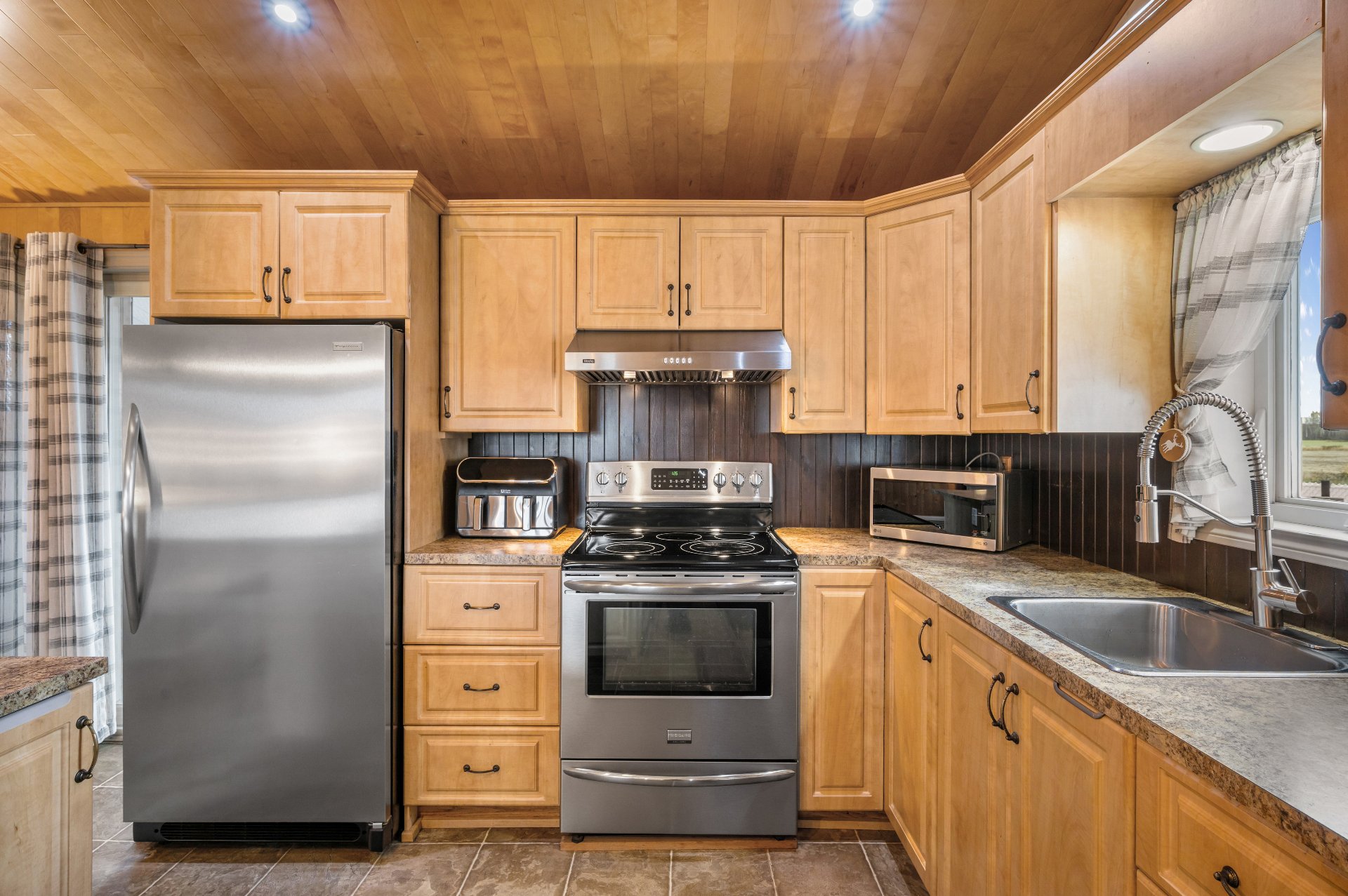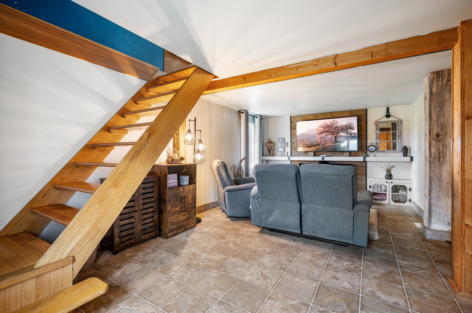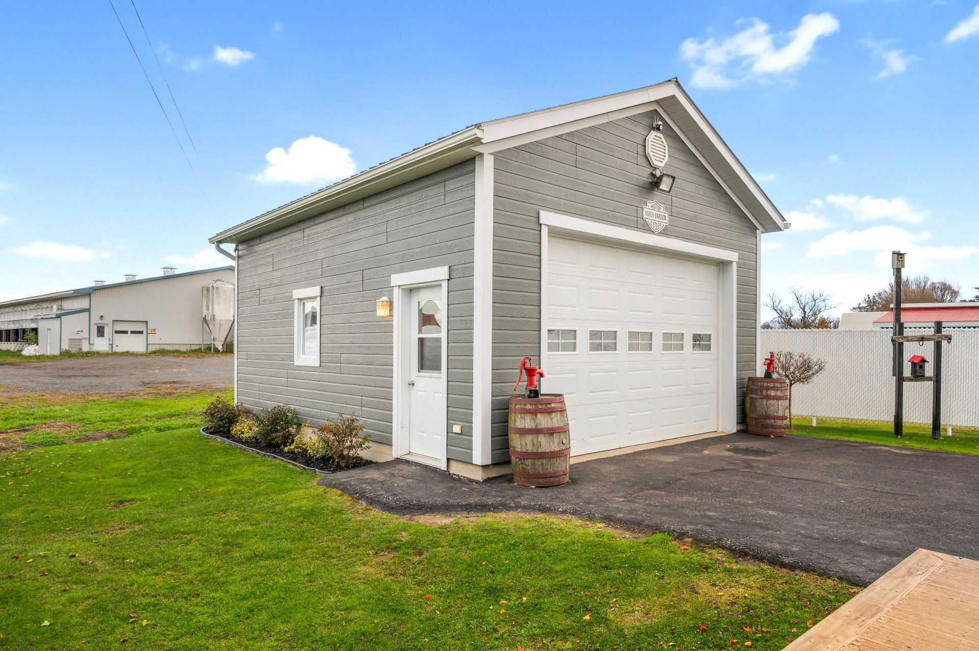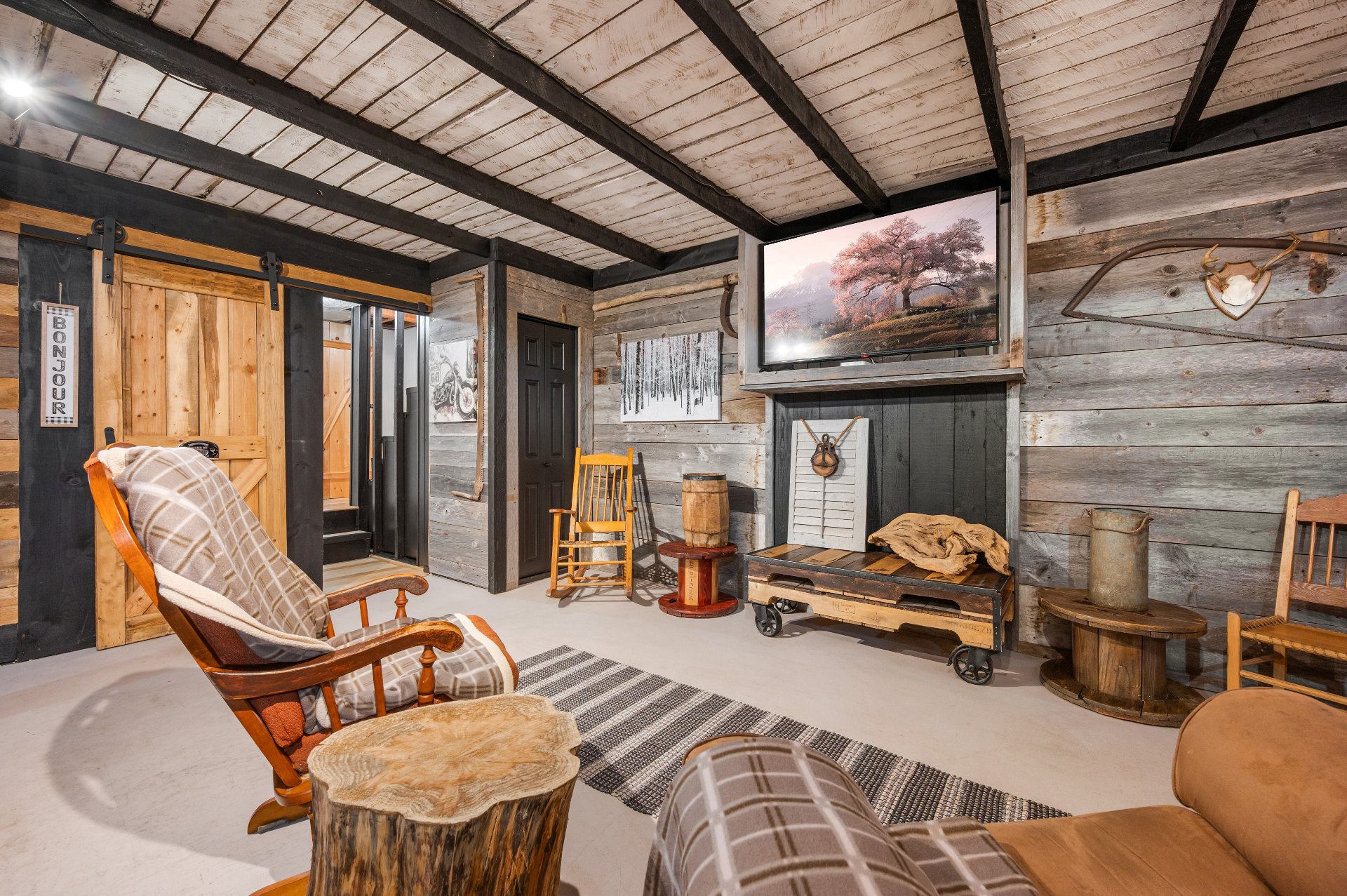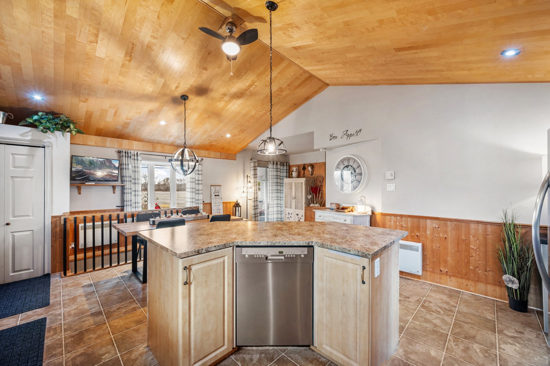 Luminaires de la SDM et de la cuisine, pôles et rideaux. Porte de bois de granche au sous-sol avec sa rail, les clôtures de perches, le banc de parc & les deux barils de bois extérieurs. Les coffres de stainless du garage