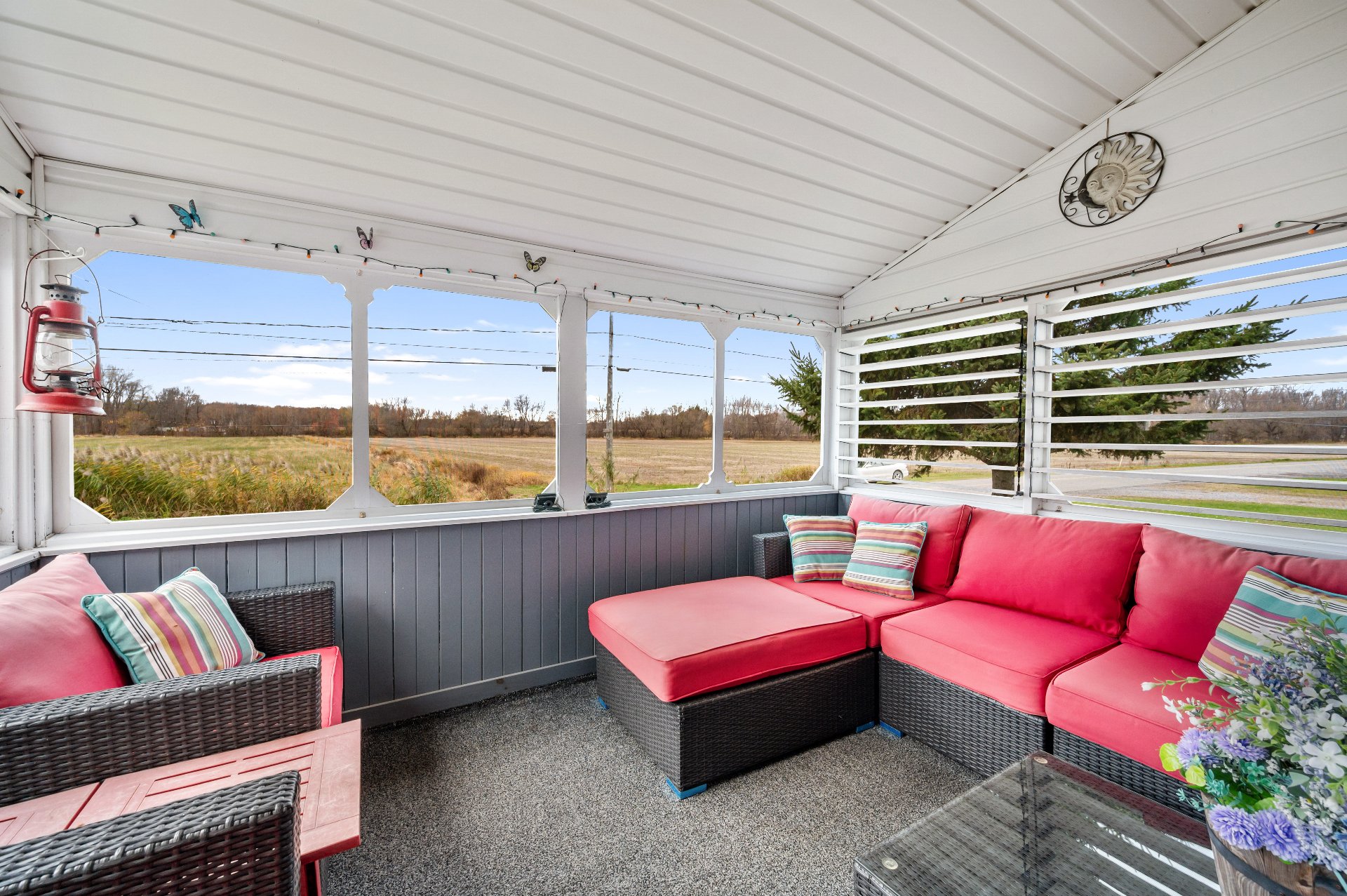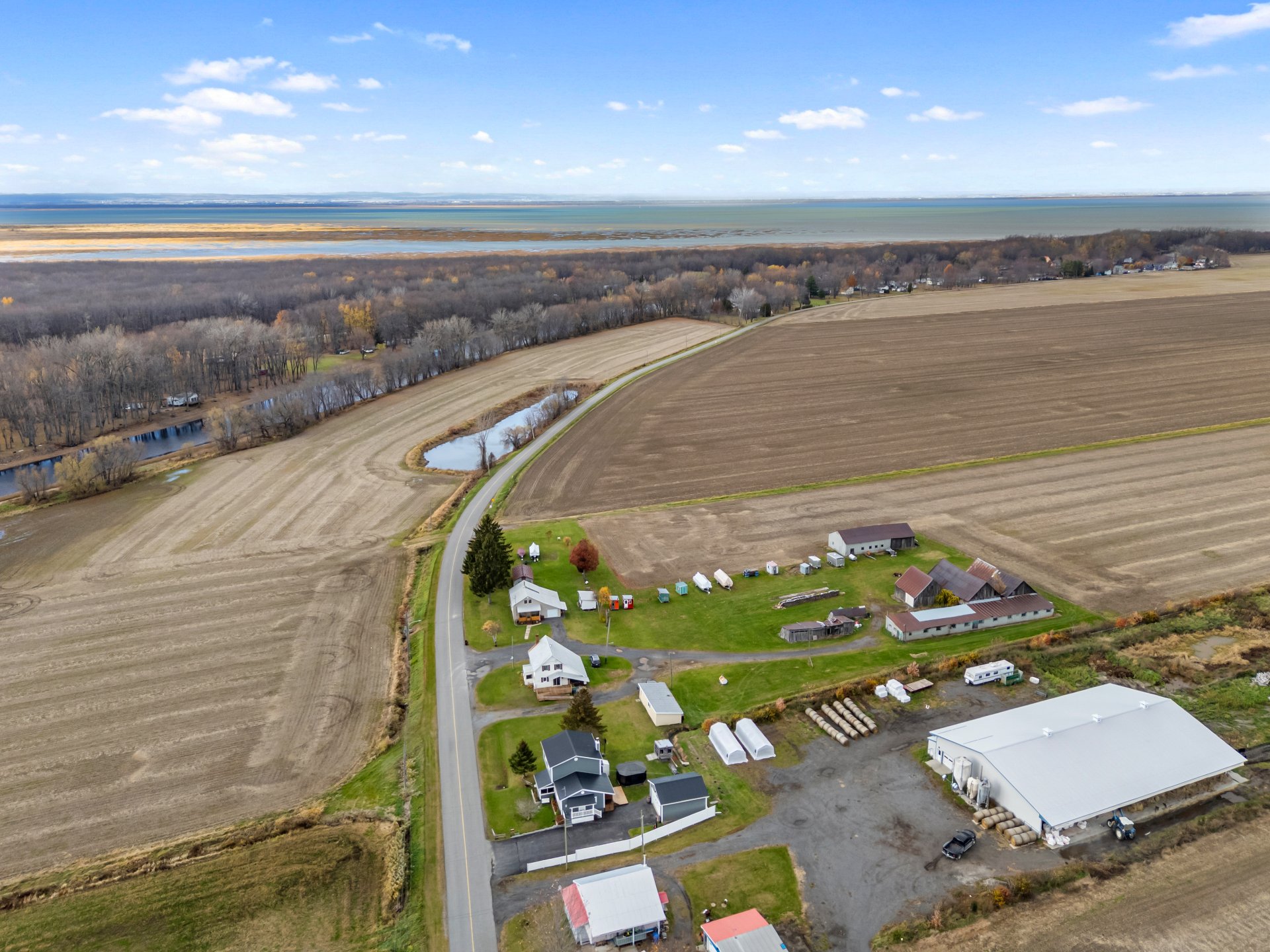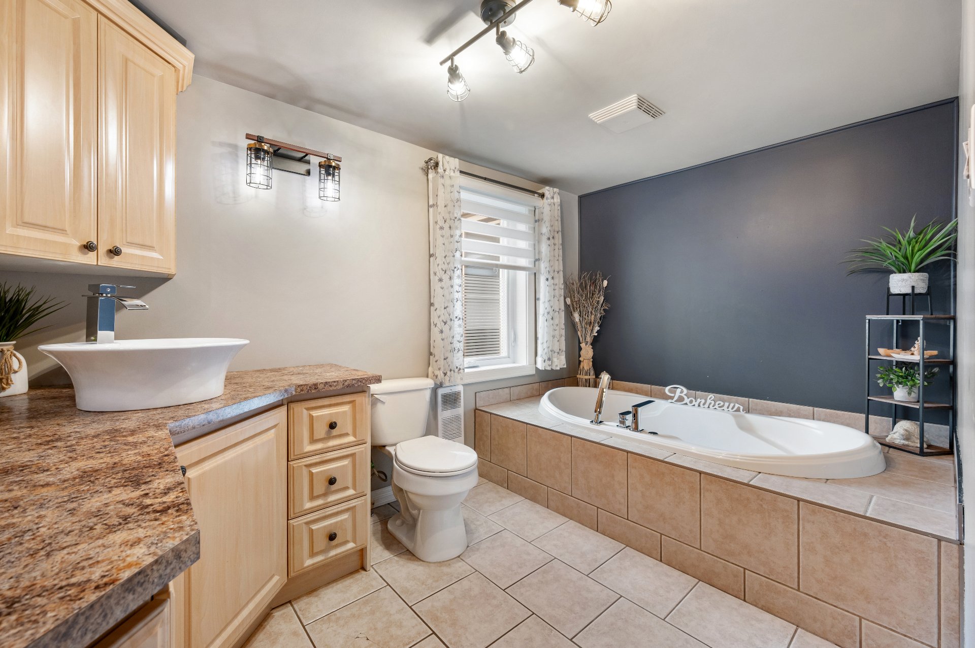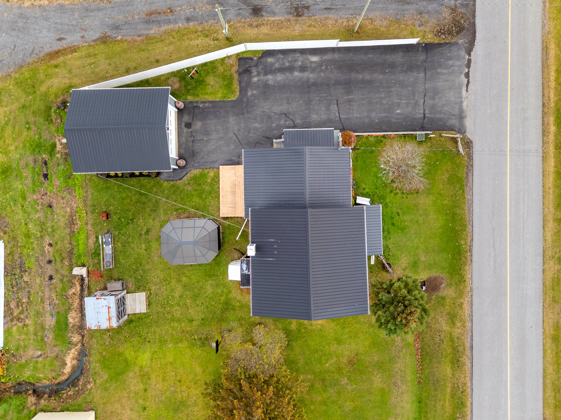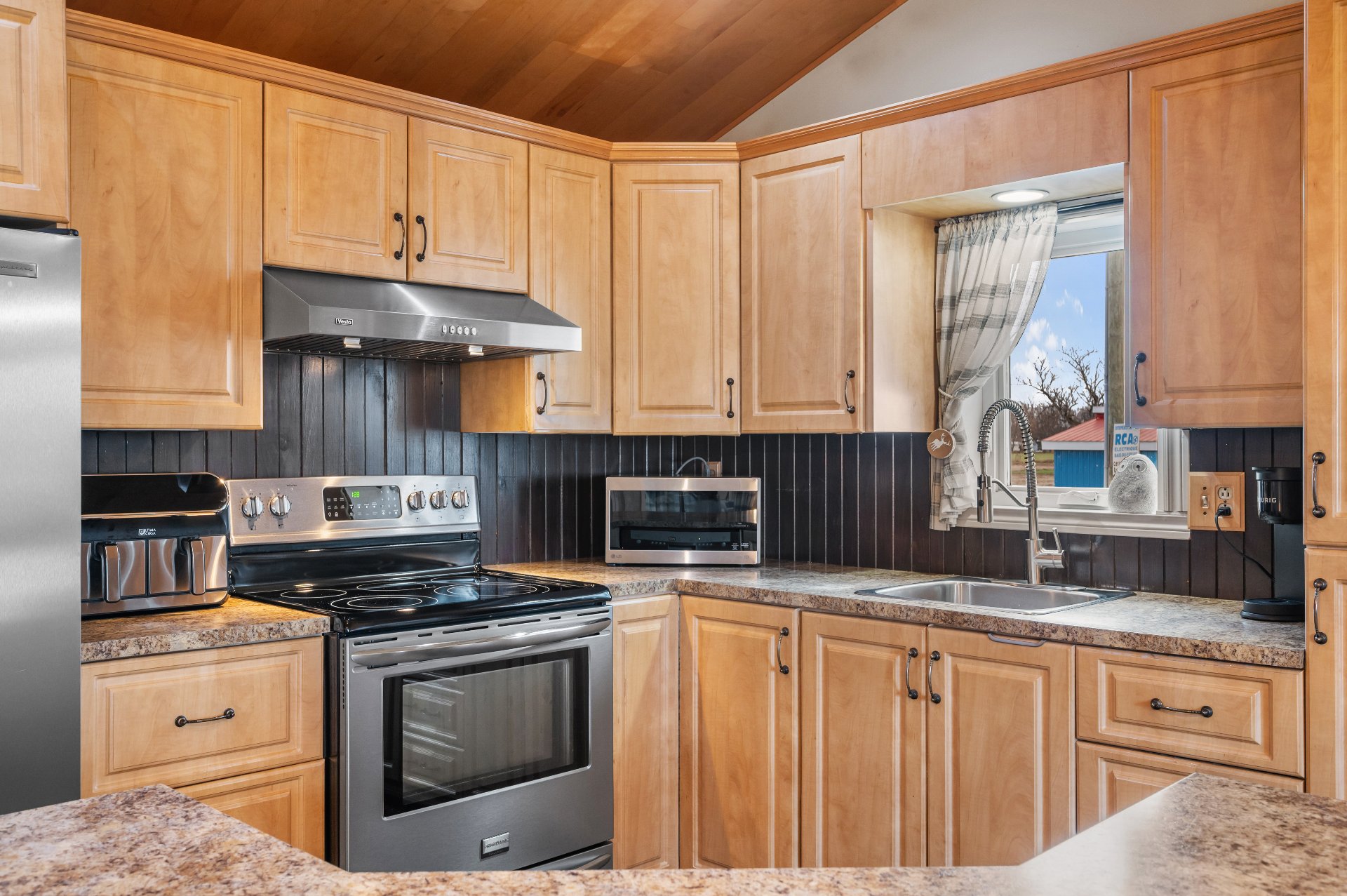 Luminaires de la SDM et de la cuisine, pôles et rideaux. Porte de bois de granche au sous-sol avec sa rail, les clôtures de perches, le banc de parc & les deux barils de bois extérieurs. Les coffres de stainless du garage