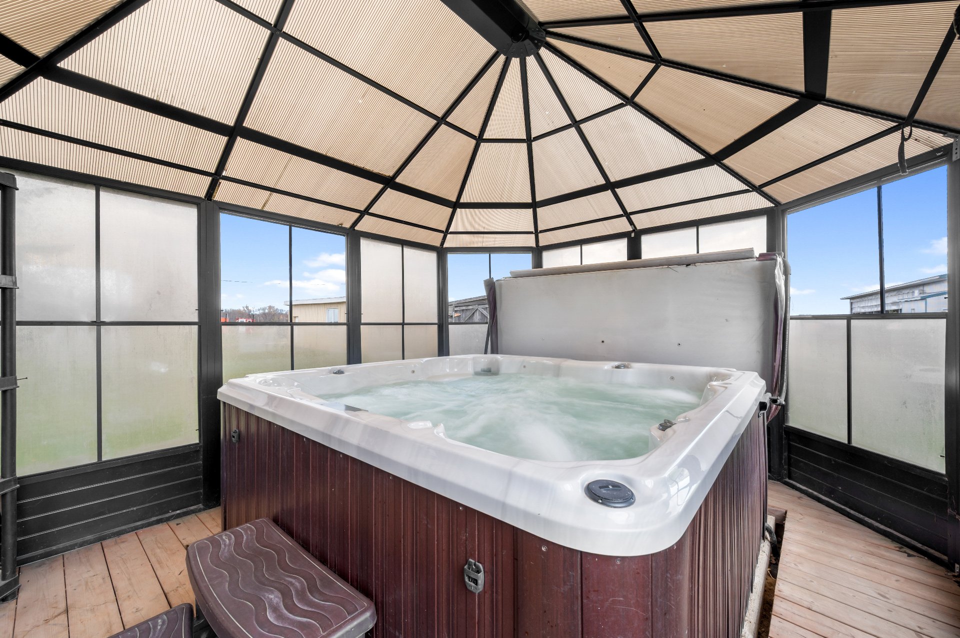 Le spa, couvre & gazebo, l'air climatisé mural, le poêle à bois du sous-sol. Les tablettes de bois du garage, son ouvre porte électrique et sa télécommande