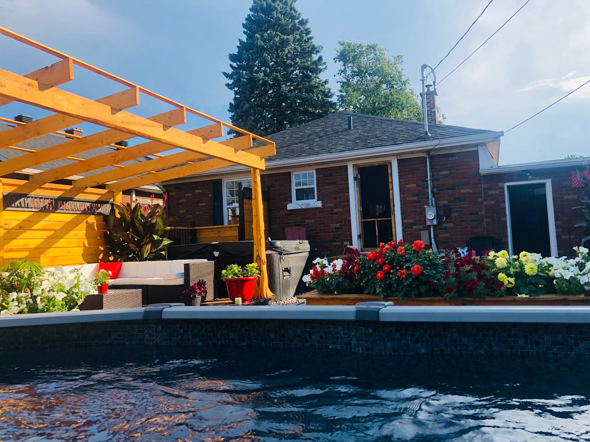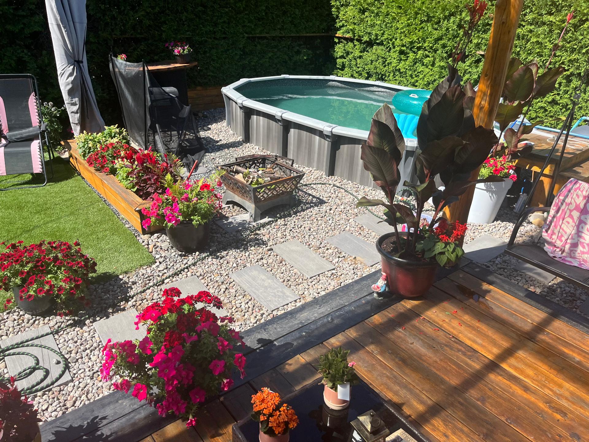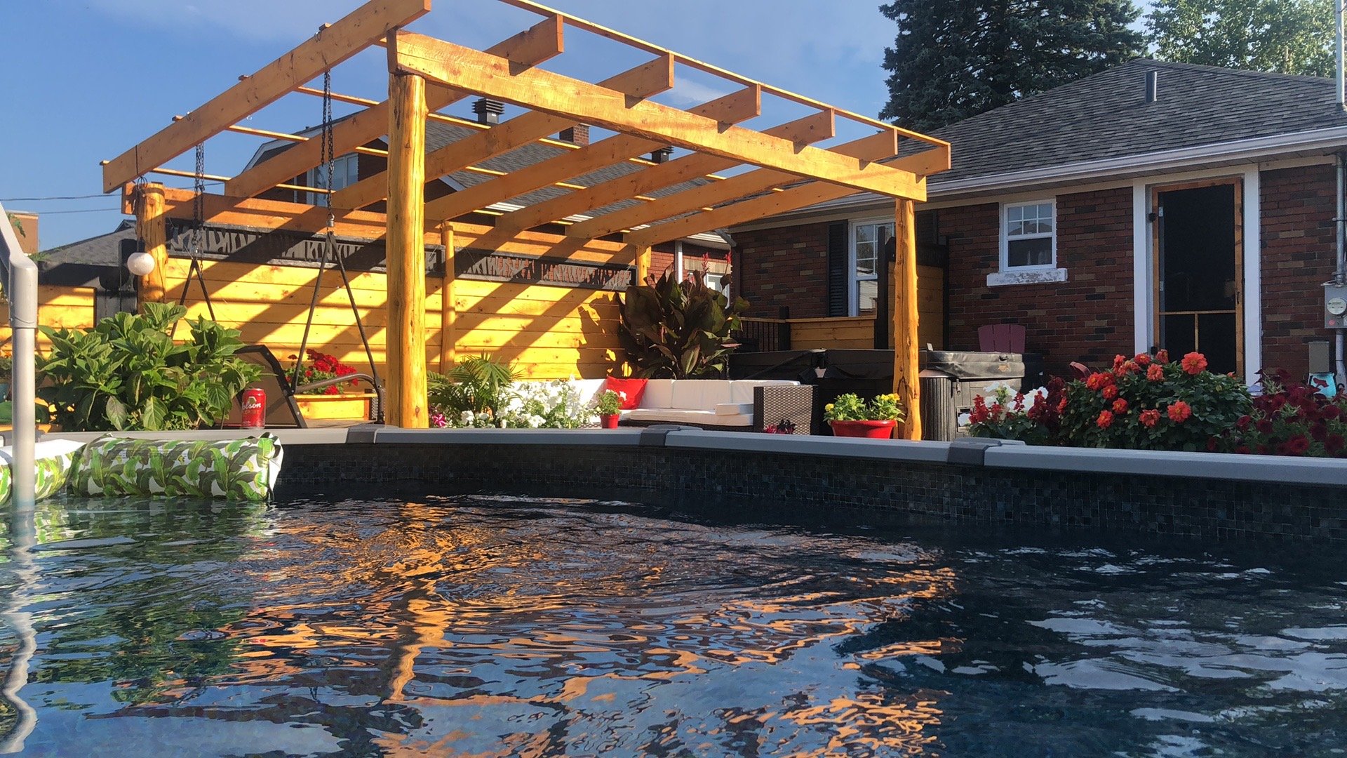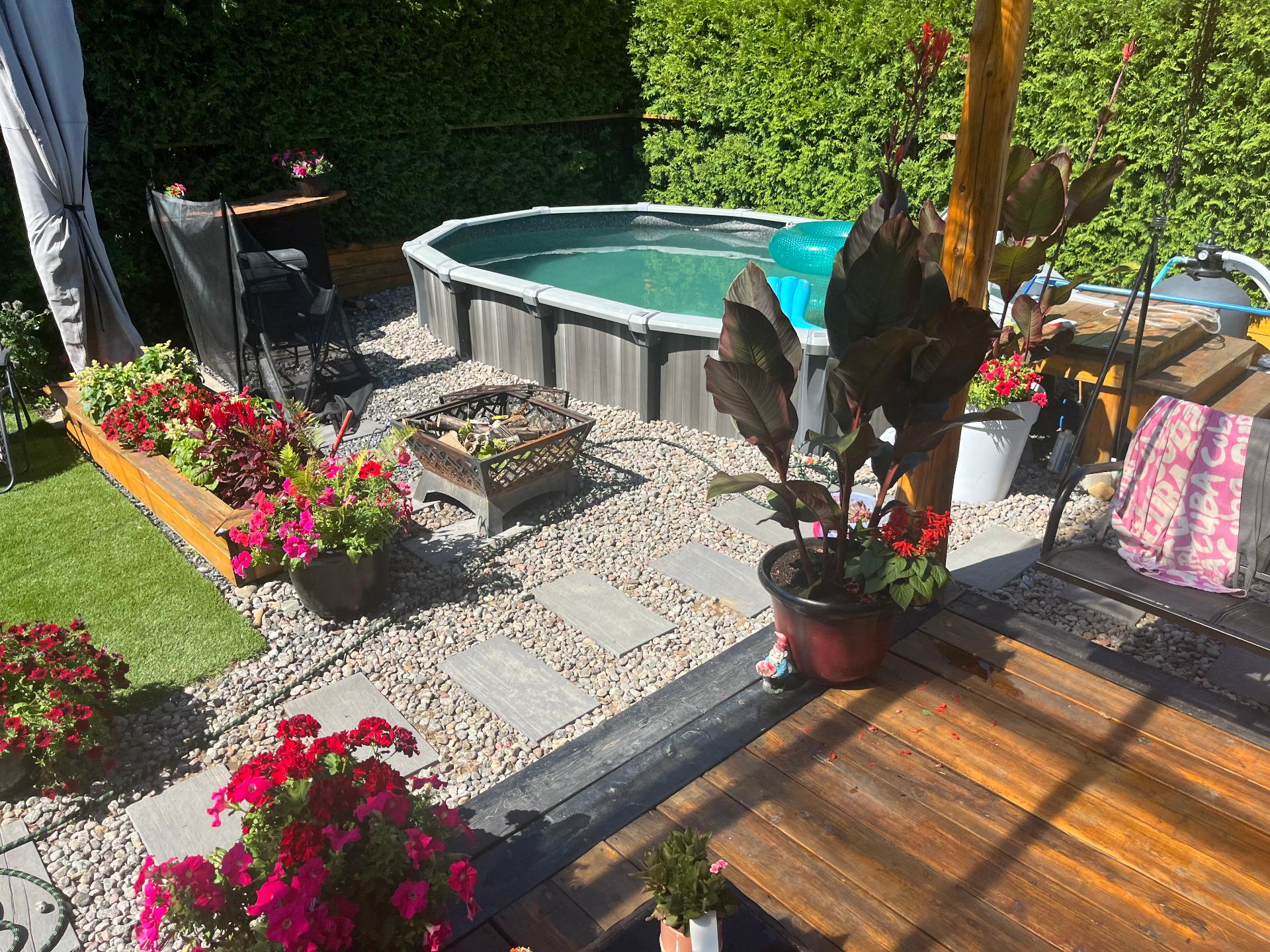 Lustres, luminaires, cuisinière, réfrigérateur, lave-vaisselle, laveuse & sécheuse. Spa (tuyauterie à réparer), piscine semi creusée 2021 10 x 15 pieds au chlore et son chauffe piscine (qui est à réparer) gazépo (permanent), remise avec courant rendu.
