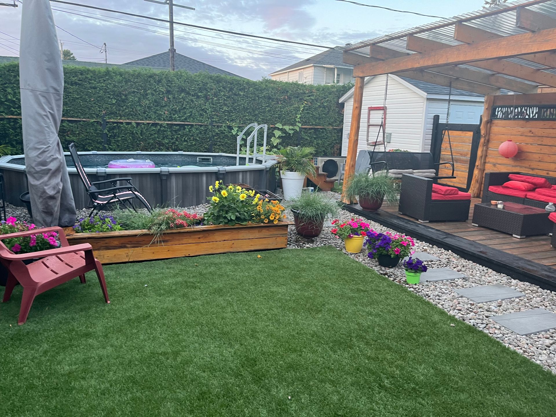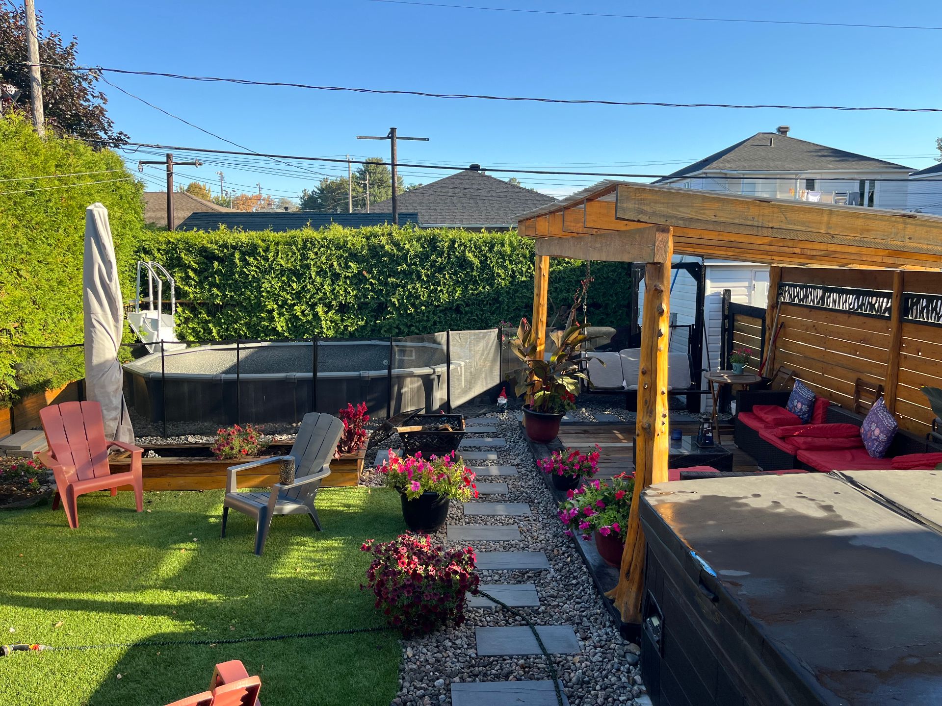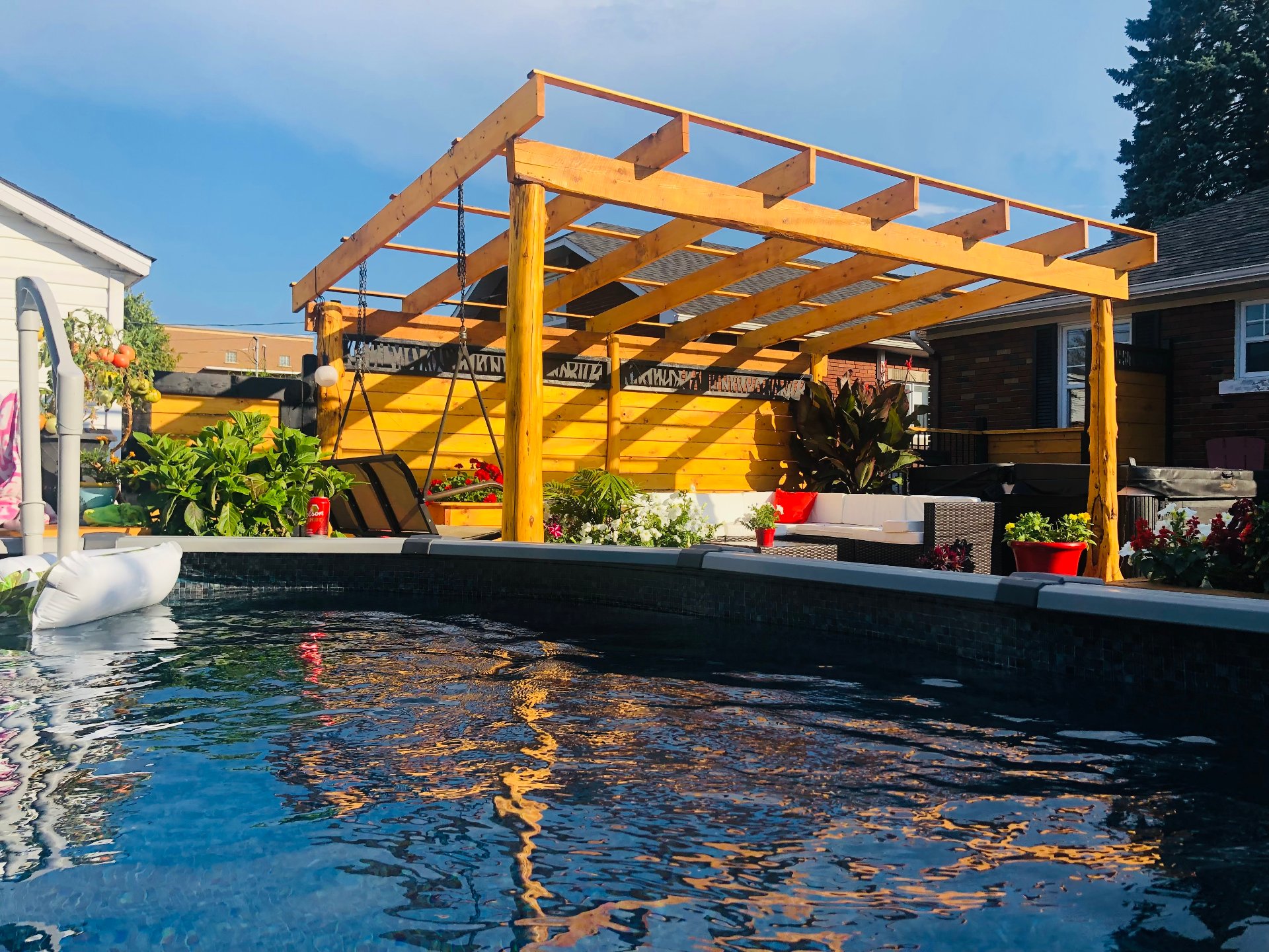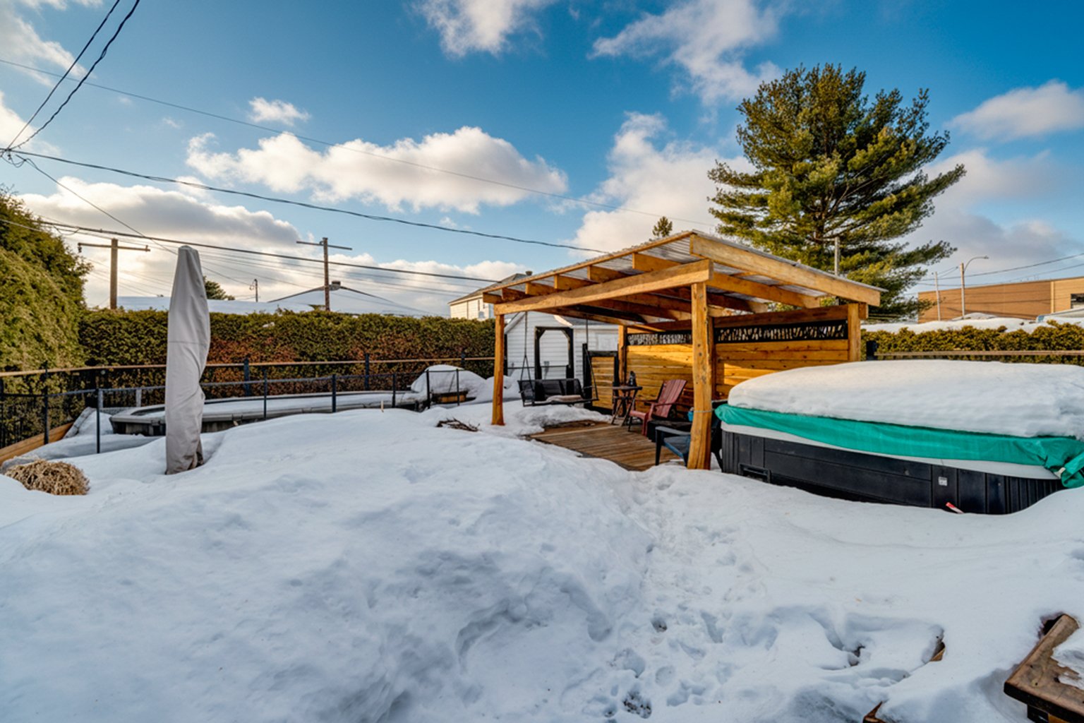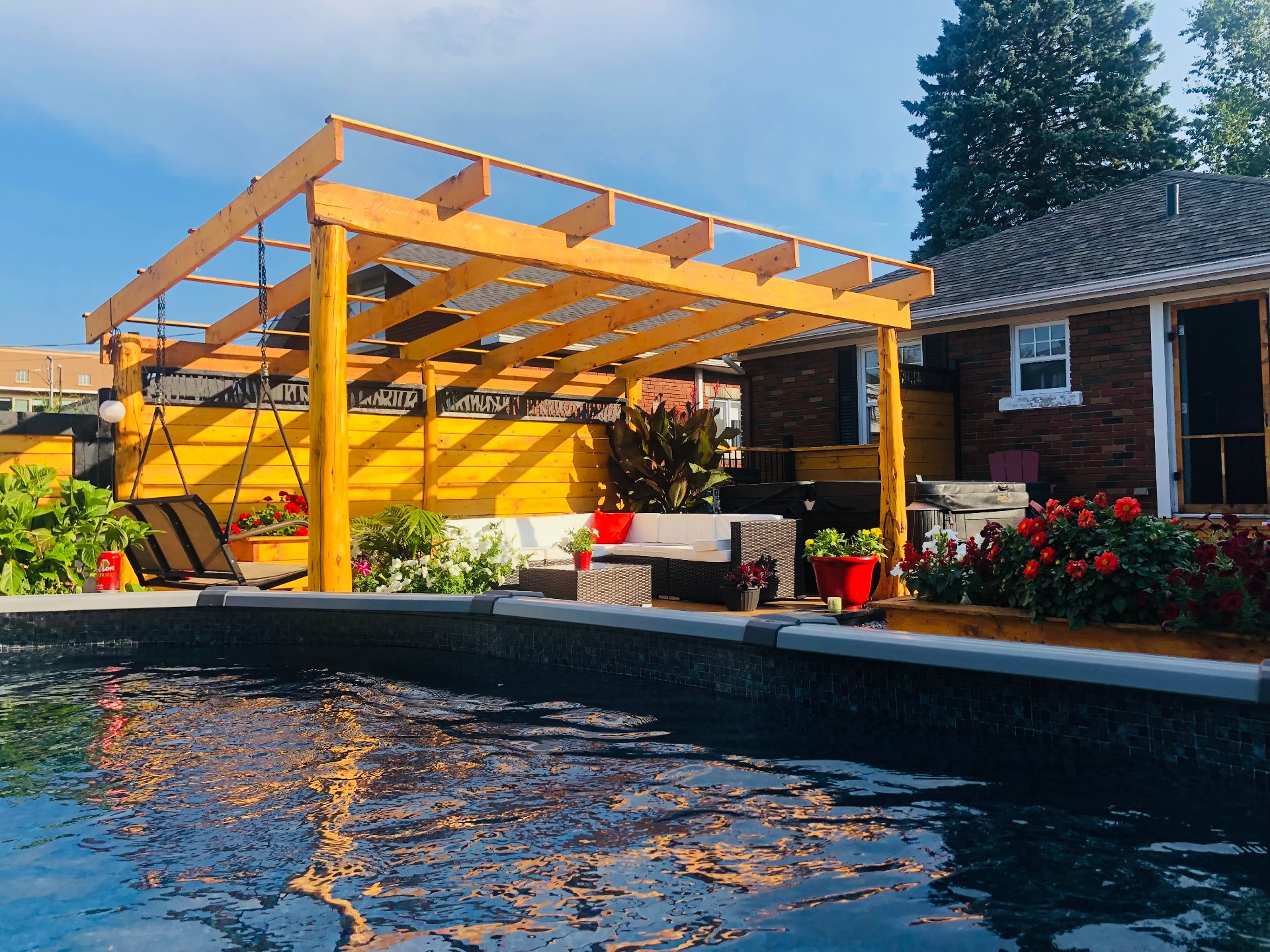 Lustres, luminaires, cuisinière, réfrigérateur, lave-vaisselle, laveuse & sécheuse. Spa (tuyauterie à réparer), piscine semi creusée 2021 10 x 15 pieds au chlore et son chauffe piscine (qui est à réparer) gazépo (permanent), remise avec courant rendu.